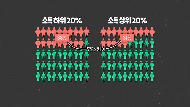 2023년 기준 소득 하위 20%의 비만율은 38%인 반면, 상위 20%는 31%로 분석됩니다. 둘 사이의 격차는 7%p나 됩니다. 하지만 저소득층이 비만을 치료하기 위해 병원을 찾는 인원은 고소득층보다 더 적은 상황입니다.