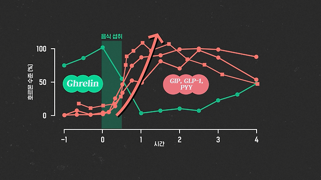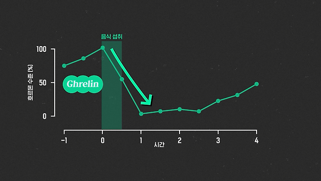 우리가 배가 고프면 우리 몸에서는 배고픔 호르몬인 그렐린이라는 녀석이 많이 만들어집니다. 식전에는 그렐린의 수치가 늘어나고 밥을 먹고 나면 감소하는 패턴을 보이죠.