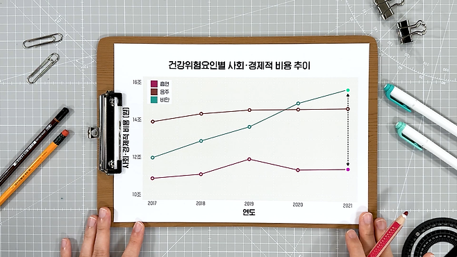 2021년 비만의 사회적 비용은 15조 6,382억 원. 흡연과 음주와 비교하면 많게는 4조 원 넘게 차이 나고 있어요. 상승세는 셋 중 가장 높아서 연평균 7% 증가하고 있습니다.