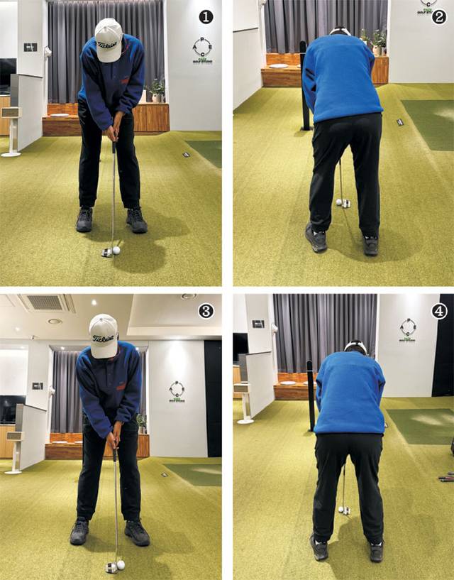 퍼팅 스트로크는 풀스윙처럼 큰 동작이 아닌 작은 동작으로 이루어져 있다. 동작이 작을수록 무게중심의 분배를 더욱 고려해야 한다. 미세한 차이가 공의 출발 방향과 거리 일관성 등을 좌우하기 때문이다. 대부분 아마추어 골퍼가 실수하는 부분은 무게중심이 오른쪽에 실려 있는 가운데 상체 기울기는 반대로 왼쪽으로 기울어 있는 모습(사진 ①, ②)이다. 이 동작은 백스윙할 때 스트로크가 낮게 시작되는 것이 아니라 수직 방향, 즉 스트로크가 높게 시작되면서 위에서 아래로 내려치는 형태의 스윙을 하게 된다.