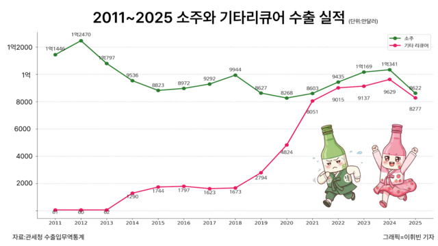 주목할 점은 두 품목 간의 격차 축소다. 2011년 일반 소주 수출액의 0.5%에 불과했던 과일소주 수출액은 2024년 93% 수준까지 따라잡았다. 2025년에는 두 품목 모두 전년 대비 수출이 감소하며 숨고르기에 들어갔지만 과일소주(8277만달러)가 일반 소주(8622만달러)를 345만달러 차이로 근접하며 대등한 경쟁 구도를 형성했다.