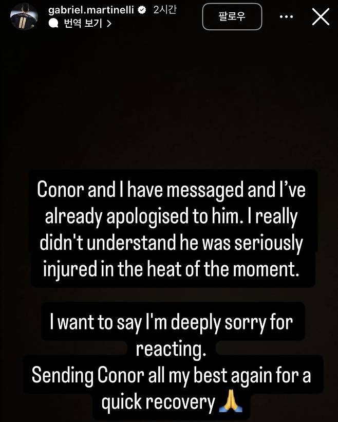 얼마 지나지 않아 마르티넬리가 사회관계망서비스(SNS)를 통해 사과를 전했다. 마르티넬리는 "브래들리와 메시지를 주고받았다. 그가 심각한 부상을 입었다는 걸 정말 몰랐다. 내 반응에 사과하고 싶다. 브래들리의 빠른 회복을 진심으로 기원한다"고 이야기했다.