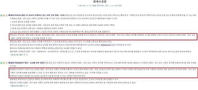 | ▲ 형사소송법 제266조의3과 제266조의4에 따르면 검사는 국가안보나 증거인멸 우려 등 상당한 이유가 있을 경우 피고인측의 열람등사 요청을 거부할 수 있고, 거부 시 법원이 중재하여 결정하도록 되어 있다. |