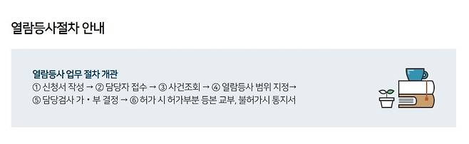 | ▲ 대검찰청 누리집에 따르면 특검 측이 언급한 열람·등사의 절차는 ① 신청서 작성 ② 담당자 접수 ③ 사건조회 ④ 열람등사 범위 지정 ⑤ 담당검사 가·부 결정 ⑥ 허가 시 허가부분 등본 교부, 불허가시 통지서 교부 등 총 여섯 단계를 거쳐 진행된다. |