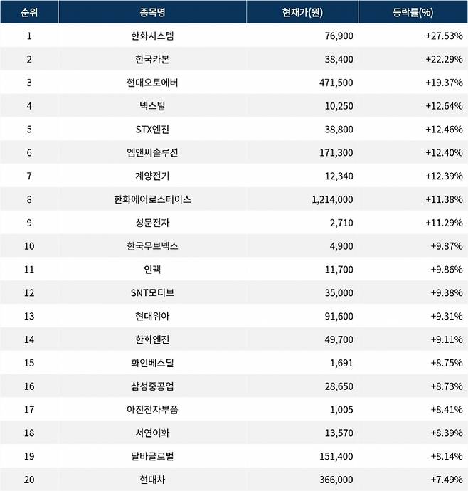 이밖에도 인팩(023810) ▲9.86%, SNT모티브(064960) ▲9.38%, 현대위아(011210) ▲9.31%, 한화엔진(082740) ▲9.11%, 화인베스틸(133820) ▲8.75%, 삼성중공업(010140) ▲8.73%, 아진전자부품(009320) ▲8.41%, 서연이화(200880) ▲8.39%, 달바글로벌(483650) ▲8.14%, 현대차(005380) ▲7.49% 등을 기록하며 금일 증시를 상승으로 마감했다.