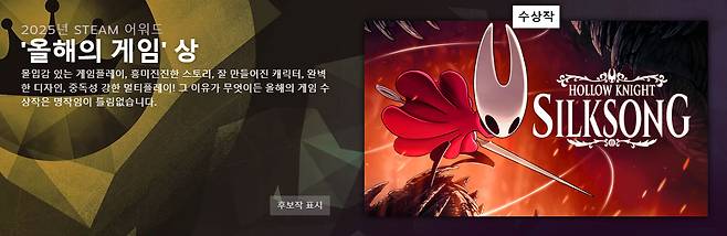 유저들이 뽑은 '올해의 게임' 상은 '실크 송'이었는데요. 이와 함께 초고난도의 게임을 선정하는 '내가 못 하는 최고의 게임' 상에도 뽑히며 2관왕에 올랐습니다.