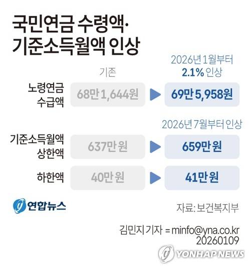 (서울=연합뉴스) 김민지 기자 = 9일 보건복지부에 따르면 올해부터 국민연금과 기초연금 수급자는 물가상승률에 따라 이달부터 2.1% 늘어난 연금을 지급받는다.