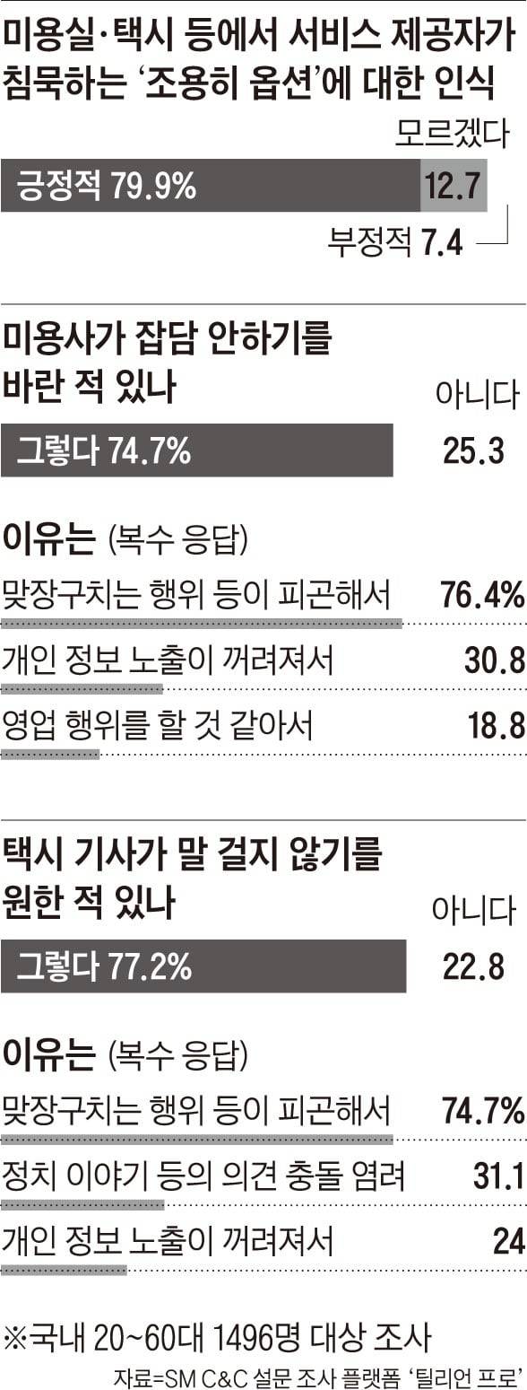 서비스 제공자들도 대체로 변화를 받아들이는 분위기다. 30년 차 미용사 조모(58)씨는 “손님이 성향을 미리 말해 주는 게 우리도 속이 편하다”고 했고, 한 30대 미용사는 “궁금하지 않은 걸 묻는 게 나도 힘들다”고 말했다. 택시 기사 김모씨는 “승객이 하차 후 앱에서 평점을 낮게 주는 것보다 원하는 것을 미리 알려주는 편이 낫다”고 말했다.
