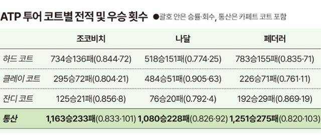 논쟁의 핵심 지표인 ‘그랜드슬램 트로피 개수’도 마찬가지다. 조코비치는 4대 메이저 대회(호주오픈, 프랑스오픈, 윔블던, US오픈)에서 역대 최다인 24회 우승을 달성했다. 1960~70년대 여자 단식 마거릿 코트(호주)와 같다. 나달은 22회, 페더러는 20회다.