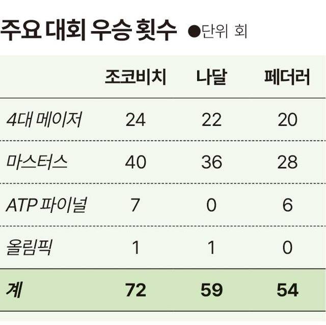 ‘시즌 왕중왕전’인 남자프로테니스(ATP) 파이널스에서도 조코비치는 7차례 정상에 올라, 빅3 가운데 최다 우승 기록을 보유하고 있다. 그랜드슬램 바로 아래 등급 대회인 마스터스 시리즈에서는 무려 40회나 우승했다. 올림픽과의 악연마저 끊어냈다. 2024년 파리 대회에서 마침내 금메달을 목에 걸며, '빅3' 중 나달에 이어 두 번째 ‘커리어 골든 그랜드슬램’을 완성했다. 4개의 빅 타이틀(그랜드슬램, ATP 파이널스, 올림픽, 마스터스) 우승 횟수를 모두 합치면, 조코비치는 72회다. 나달(59회), 페더러(54회)와는 격차가 분명하다.