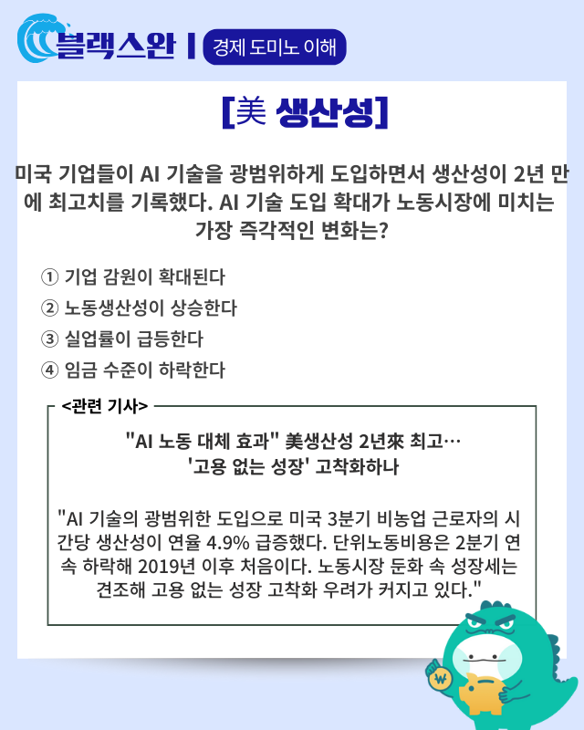 ▶ 기사 바로가기: “AI 노동 대체 효과” 美생산성 2년來 최고···‘고용 없는 성장’ 고착화하나