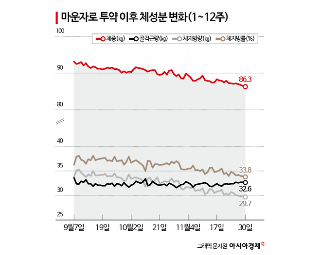 마운자로 투약 12주 동안 약 7㎏가량을 감량했다. 지난해 9월 7일 93.1㎏에서 11월 말 86.3㎏까지 내려왔다 . 감량 과정에서 체지방량은 33.8㎏에서 29.7㎏까지 줄어 체중 감소의 중심은 체지방이었다. 골격근량은 33.6㎏에서 32.6㎏으로 1㎏ 내외 변동에 그치며 비교적 유지되는 흐름을 보였다. 다만 투약을 종료하는 단계에서는 용량으로 주기와 용량을 조절하며 천천히 줄여가는 이른바 소프트랜딩을 시도했음에도, 약효가 약해지면서 공복감과 식욕이 살아났고 일상 속 식사량이 눈에 띄지 않게 늘어났다. 마운자로 투약 중단 후 약 두 달 동안 3㎏가량 체중이 재상승했다.