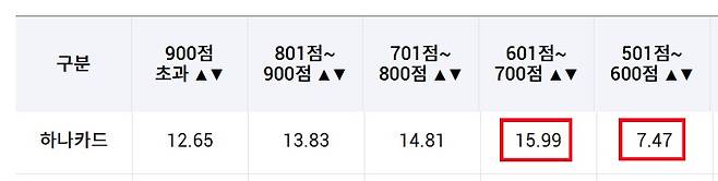 지난해 4월 여신금융협회에 공시된 하나카드의 3월 카드론 금리 중 신용점수 600점대(601~700점) 대출자의 평균 금리는 15.99%입니다.