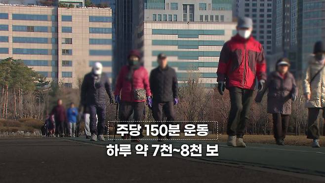 미국 하버드 공중보건대학원의 이민 리 교수는 "대부분의 사람들에게 주당 150분 운동은 하루 약 7천~8천 보에 해당한다"고 말합니다. 나이에 따라 걸음 수를 조절할 수 있는데, 60세 미만은 하루 약 8천~만 보, 60세 이상은 하루 약 6천~8천 보가 적당합니다.