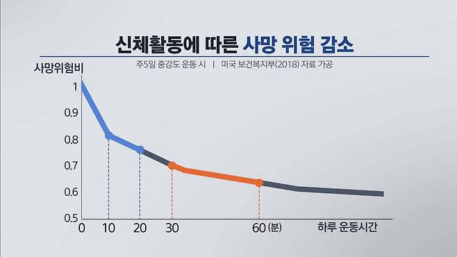 하루 30분에 못미친다고 해도 크게 실망할 필요는 없습니다. 하루에 10분, 20분씩이라도 꾸준히 운동하면 사망 위험이 20% 이상 줄어듭니다(그래프의 급하강 구간).