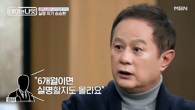 공개된 선공개 영상에서 송승환은 "정확한 병명이 뭐냐"는 질문에 "황반변성이기도 하고, 망막색소변성증이 변화된 증상이 있다고 하더라"라며 망막 손상을 고백했다.
