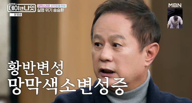 이에 송승환은 "황반변성이기도 하고 망막색소변성증이 조금 변화된 증상이었다. 망막에 이상이 있는 거다. 까맣게 안 보이는 게 아니라 안개가 잔뜩 끼어서 잘 안 보이는 거다. 형체는 보인다"고 말했다.