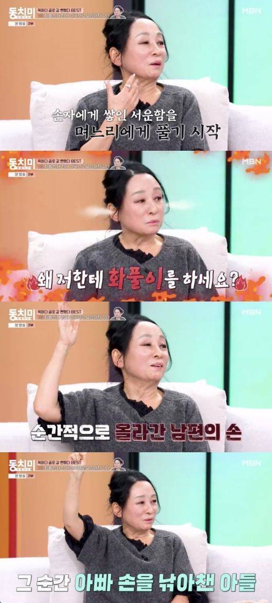 그는 "아들이 학교를 가다가 소리를 듣고 느낌이 이상해서 집으로 다시 왔는데 남편이 순간적으로 손을 올렸다. 아들이 그 손을 잡았다. 아들이 '엄마는 잘못한 게 없다. 엄마는 지금 아프다'고 했다. 신고가 들어가서 경찰이 오기까지 했다"고 했다.