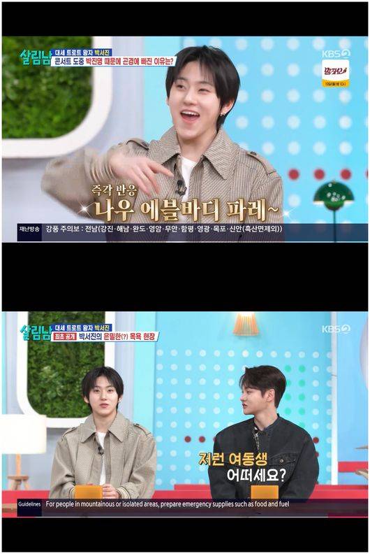 박서진은 "옛날에 낯을 가려서 회식도 못 가고 그랬다. 성인이 되고 '살림남'하면서 사회를 배우고 있다"라며 수줍어했고, 계훈은 "이게 최우수상의 숙취!"라며 야무지게 멘트를 쳤다.