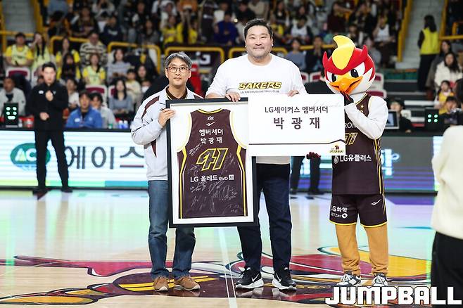 창원 LG는 10일 창원체육관에서 열린 고양 소노와 맞대결에서 앞서 박광재의 구단 엠버서더 임명식을 진행했다.