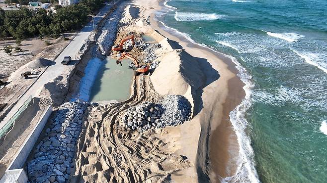 2026년 1월, 강릉시 주문진읍 향호리 해안가에서는 해안도로 공사가 한창이다. 한때 넓게 펼쳐졌던 모래해변 위로 중장비가 들어서며, 해안선과 불과 몇 미터 떨어진 지점까지 콘크리트 기초공사가 이어지고 있다. 해안도로 조성을 위해 자갈과 골재가 해변 곳곳에 쌓여 있고, 굴착기와 덤프트럭 등 공사 장비는 파도가 밀려오는 사이에도 쉼 없이 움직인다. 그 과정에서 자연스럽게 이동하던 모래해변은 공사 일정에 맞춰 다져지고 형태가 바뀌고 있다.