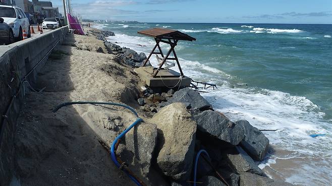 | ▲ 사천진해변 해안도로 옆 모래가 파도에 씻겨 내려가며 편의시설물이 기울어 붕괴 직전의 상태에 놓여 있다. 지반이 약화된 해안도로 역시 하부가 노출돼, 추가 파랑이 이어질 경우 도로 붕괴 위험 직전까지 갔던 해변(2021/9) |