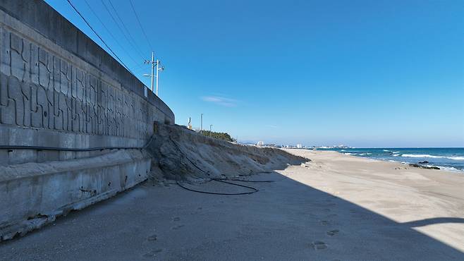 | ▲ 해안 침식으로 모래가 씻겨 내려가면서 사천진 해안도로 하부와 기존 시설물이 그대로 드러난 모습. 파도에 의해 지반이 약화돼 도로와 콘크리트 구조물이 붕괴 위험에 노출돼 있다.(2026/1/7) |