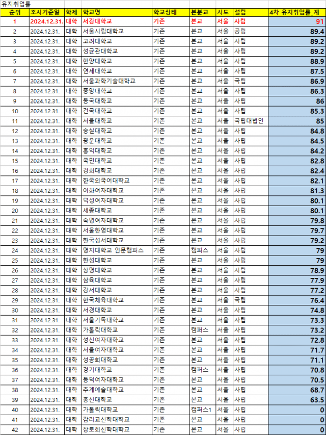 또 대학 졸업자가 취업 후 일정 기간이 지난 후에도 취업상태인지를 보여주는 '유지취업률'은 취업의 질적인 면을 보여주는 척도인데, 서강대학교는 4차 유지취업률 역시 서울 소재 대학 중 3년 연속 1위를 차지했다.