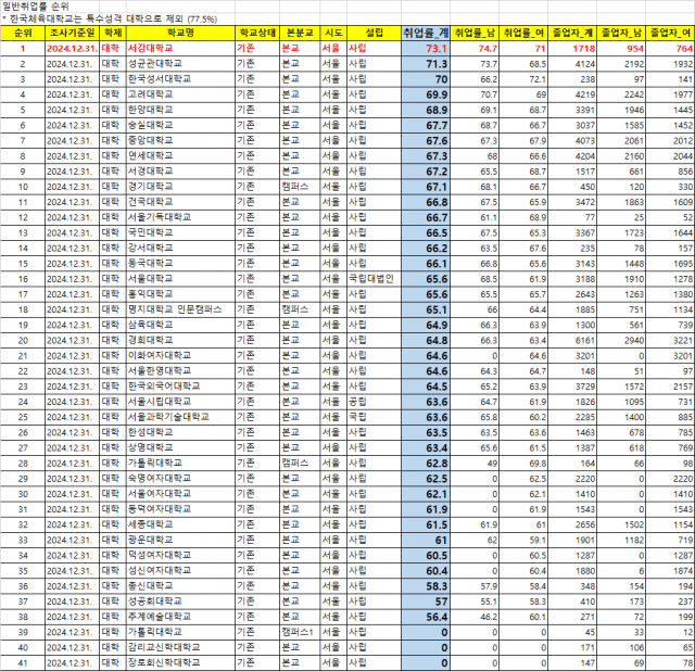 서강대, 서울 소재 4년제 대학 취업률 1위