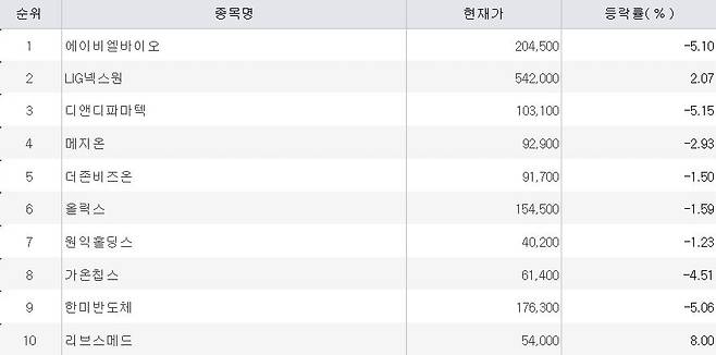3위 디앤디파마텍, 4위 메지온, 6위 올릭스, 10위 리브스메드 등 바이오 종목이 대거 순매수 상위권에 올랐다. 오는 12일부터 미국에서 개최되는 세계 최대 제약·바이오 투자 행사인 JP모간 헬스케어 콘퍼런스를 앞두고 매수세가 몰렸다는 평가다.