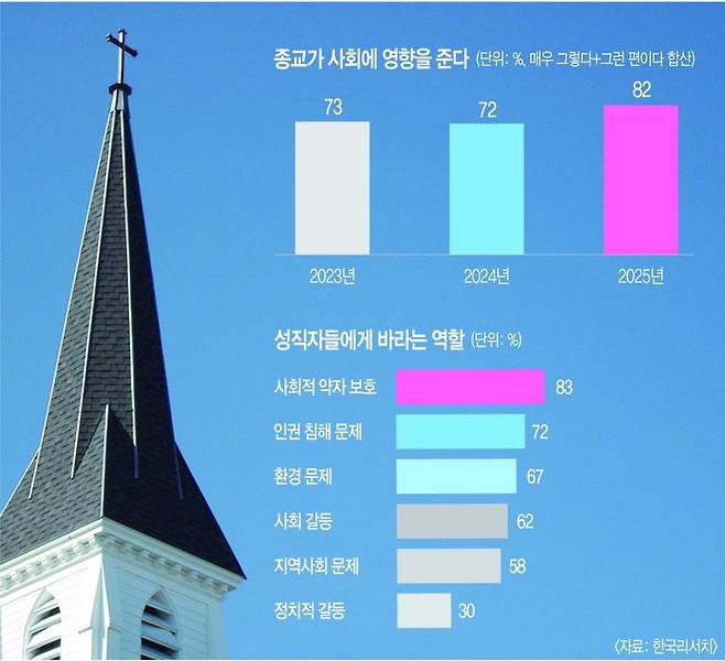 한국리서치가 최근 발표한 ‘종교의 사회적 역할과 종교갈등 인식’ 결과를 보면 “종교가 한국 사회에 영향을 주고 있다”는 응답은 82%로 집계됐다. 지난해 조사(72%)보다 10% 포인트 늘어난 수치로, 조사가 시작된 2020년 이래 가장 높은 비율이다.