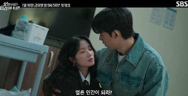 16일 SBS 새 금토드라마 '오늘부터 인간입니다만'측은 11일, '취미 부자' 구미호 은호(김혜윤 분)와 '가난한 천재' 인간 강시열(로몬 분)의 심상치 않은 만남이 담긴 1회 예고편을 공개했다.