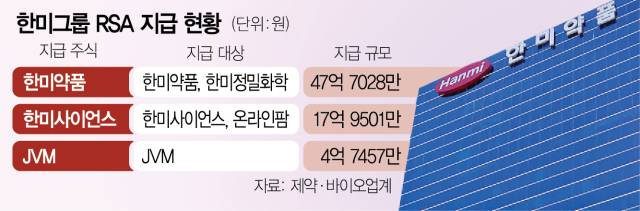 11일 업계에 따르면 한미사이언스(008930), 한미약품(128940), 한미정밀화학, 온라인팜, 제이브이엠(054950)(JVM) 등 한미그룹은 임직원에 대한 생산성 장려금 주식지급(RSA)을 위해 각 사가 보유하고 있는 자기주식을 처분하기로 결정했다고 밝혔다.