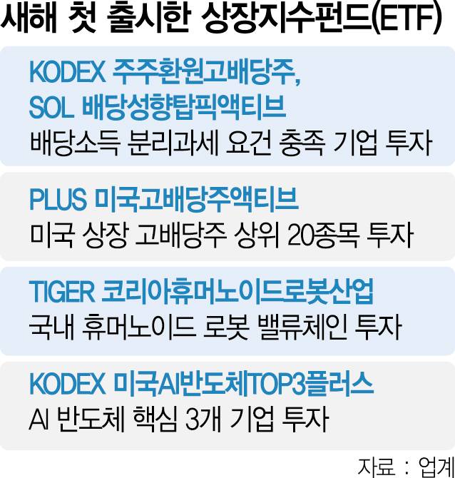 이밖에 KB자산운용은 AI·반도체, 바이오, 방산, 에너지 등 신정부 전략산업에 투자하는 ‘RISE 코리아전략산업액티브’를, 한국투자신탁운용은 ‘ACE 리츠부동산인프라액티브’를 준비 중이다. 업계 관계자는 “지난해부터 이어져 온 고배당과 AI 테마 투자 열풍은 올해에도 지속될 것”이라며 “홍수처럼 쏟아지는 상품들을 꼼꼼히 따져보고 투자할 필요가 있다”고 말했다.