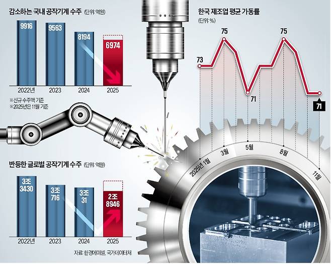 일본과 비교하면 격차가 더 뚜렷해진다. 일본공작기계공업회가 집계한 지난해 11월까지 일본의 누적 수주액은 1조4456억엔으로 전년 동기 대비 7.7% 늘었다. 일본 공작기계 업체들의 국내 수주액은 4009억엔으로 1년 전(4016억엔)과 거의 비슷했다. 대미 관세 협상 과정에서 관세 부담과 현지 투자 압박이라는 공통 변수를 안고 있는데도 한·일 간 내수 흐름은 엇갈린 셈이다.
