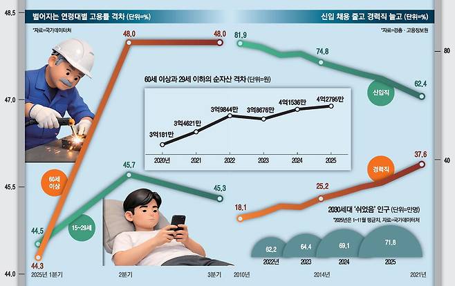 청년이 좋은 일자리를 구하지 못하고 사회 진출 시기도 늦어지면서 청년층과 고령층의 자산 격차는 계속해서 벌어지고 있다. 지난해 데이터처가 발표한 '2024년 가계금융복지조사'의 연령대별 순자산액을 보면, 2020년 29세 이하 청년과 60세 이상 고령층의 순자산 규모는 각각 7241만원과 3억7422만원으로 격차는 3억181만원이었다.