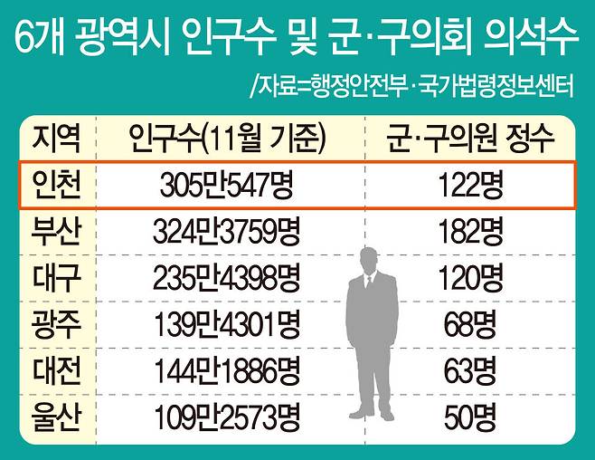 공직선거법이 규정한 군·구의회 의원 정수 또한 인천이 122명에 불과한 반면, 부산은 182명이다. 지난해 말 기준 235만3032명으로 인천과 인구수 격차가 70만명까지 벌어진 대구 기초의원 정수도 120명이다.