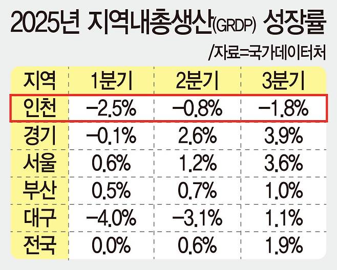 수도권 규제에 시달리는 지역 경제 위기감은 현실화하고 있다. 인천 지역내총생산(GRDP) 규모는 2024년 125조5920억원으로 제2도시 위상을 유지했지만, 국가데이터처가 최근 발표한 '2025년 3분기 실질 지역내총생산(잠정)' 자료를 보면 지난해 1분기 -2.5%, 2분기 -0.8%, 3분기 -1.8%로 역성장을 거듭했다.