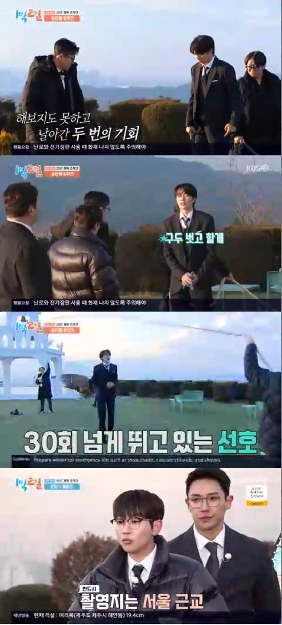 유선호는 두 번째 시도에서 구두 굽에 줄이 걸리면서 또 실패를 하게 됐다. 예민해진 멤버들은 "쟤 왜 저래"라고 입을 모았다. 유선호는 구두를 벗고 하겠다고 말했다.