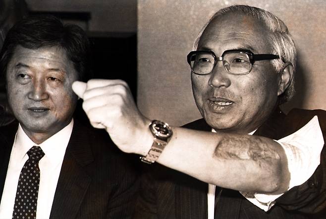 | ▲ 12·12 쿠데타에 맞선 정병주 전 특전사령관 (오른쪽). 12·12 쿠데타 당시 팔에 총상을 입은 자리를 보여주고 있다. |