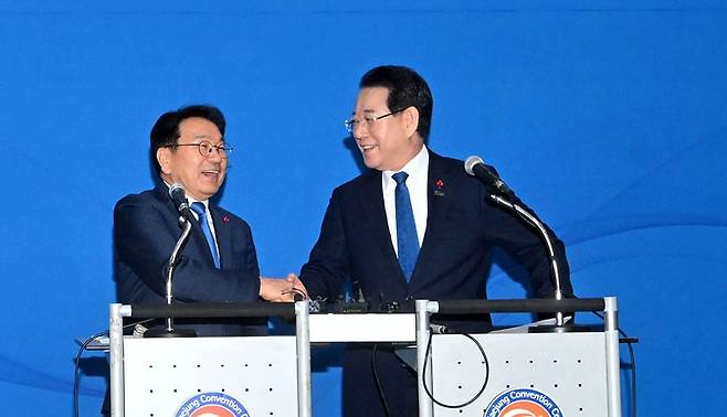 | 강기정 광주시장과 김영록 전남지사가 지난 9일 오후 광주 서구 김대중컨벤션센터에서 열린 광주·전남 행정통합 시·도민 보고회에서 합의문을 발표하고 있다./조영권 기자 |