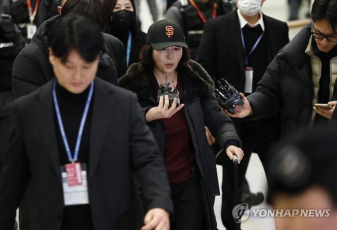 (영종도=연합뉴스) 윤동진 기자 = 2022년 지방선거 국면에서 더불어민주당 소속이던 강선우 의원에게 '공천헌금' 1억원을 전달한 의혹을 받는 김경 서울시의원이 11일 인천국제공항 1터미널을 통해 입국하며 취재진 질문에 답하고 있다. 2026.1.11
