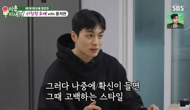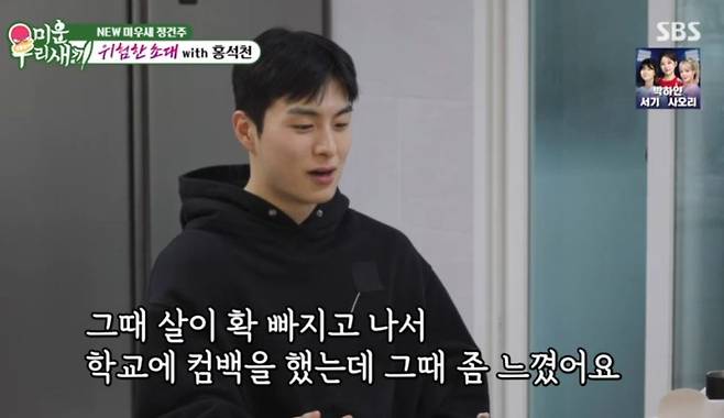 이날 홍석천이 정건주에게 물은 건 "화면으로 봐도 잘 생겼지만 실물도 잘생겼다. 언제부터 그렇게 잘생긴 건가"라는 것이다. 이에 정건주는 "운동을 시작한 뒤 같다"면서 "중3 여름방학 때 엄청나게 운동을 했다. 그때 살이 쭉 빠지고 개학이 됐는데 여학우의 시선을 받으며 달라졌다는 걸 느꼈다"라고 솔직하게 고백했다.