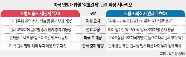정부도 연방대법원의 판결 시나리오별로 국내 기업과 산업에 미칠 여파 등을 점검하고 있다. 여한구(사진) 산업통상부 통상교섭본부장은 이날 오전 미 무역대표부(USTR) 등 행정부와 의회, 기업 관계자 등을 만나기 위해 방미길에 오르며 “판결이 임박한 상황에서 미 정부와 업계 동향을 사전에 파악하고자 한다”고 말했다. 미국 측 인사들과 접촉해 관세 등 통상 현안을 논의하고, 국내 산업에 미칠 영향을 최소화하기 위한 대응 전략을 마련한다는 방침이다. 정부 관계자는 “선고 결과를 예단할 수 없지만 (시나리오별로) 대응하기 위해 예의주시하는 상황”이라고 말했다.