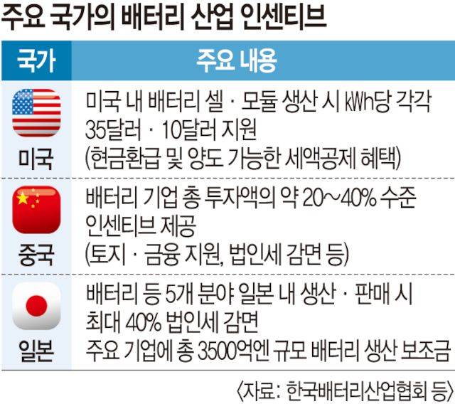 중국 역시 설비투자·부지 지원, 운영자금과 금융이자 지원, 법인세 감면 등 배터리 업계를 전방위로 지원하는 중이다. 5개 전략물자에 전기차 배터리를 포함한 일본도 지난해 3500억엔(약 3조 2000억원) 규모의 생산 보조금을 배정했다.