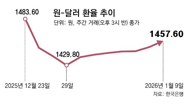 원-달러 환율이 연초부터 지난해 연고점(1487.6원) 수준으로 다시 치솟을 경우 서민 물가와 기업의 원가 비용 부담이 커질 것으로 전망된다. 정부는 올해를 경제 대도약의 원년으로 만들겠다는 목표를 내놨지만 한국은행의 통화정책에도 제약이 커지면서 경제성장률 반등에 걸림돌이 될 것이란 우려도 나온다.