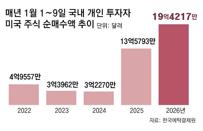 국내 개인투자자가 미국 주식에 투자하려면 원화를 달러로 바꾸는 절차를 먼저 거쳐야 한다. 연초 ‘서학개미’의 대규모 매수세는 원-달러 상승 압력으로 작용할 수밖에 없다.