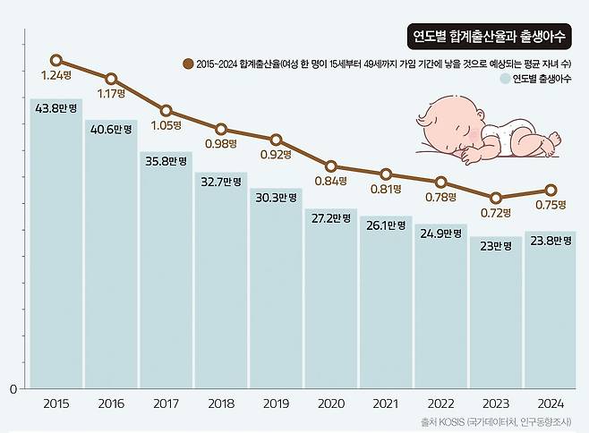 저출생 문제는 우리 사회가 풀어야 할 과제 중 하나로 꼽힙니다. 출생아수는 지난 30년간 급격히 감소했는데요. 1995년 71만5000명이었던 출생아수는 2005년 43만8000명으로 대폭 줄었고, 2023년 23만 명까지 계속 줄었습니다. 합계출산율은 1995년 1.63명에서 2005년 1.08명까지 낮아졌고, 2018년 0.98명으로 0명대에 진입해 2023년 0.72명까지 하락했어요. 세계 전체 평균인 2.3명에 한참 못 미치는 낮은 수준으로 국가 비상사태라는 평가도 나왔죠.