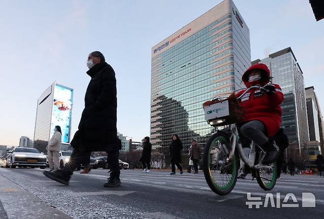 [서울=뉴시스] 배훈식 기자 = 서울 아침 최저기온 영하 9도 등 전국 곳곳에 한파 특보가 내려진 12일 오전 서울 종로구 세종대로사거리에서 두꺼운 옷차림의 시민들이 출근길 발걸음을 옮기고 있다. 2026.01.12. dahora83@newsis.com
