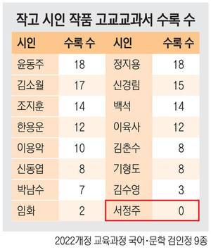 이 교수 말을 들은 후 2022 개정 교과서들을 찾아봤다. 고교 국어·문학 검인정 교과서 9종이 시 작품을 448개나 수록하고 있는데, 그중 서정주 작품은 1개도 없었다. 윤동주, 정지용 시가 각 18편으로 가장 많았고 김소월(17), 신경림(15), 조지훈·백석(14), 한용운·이육사(12) 순이었다. 생존 시인으론 나희덕(12), 문정희(9), 정희성(8) 작품이 많이 실렸다.